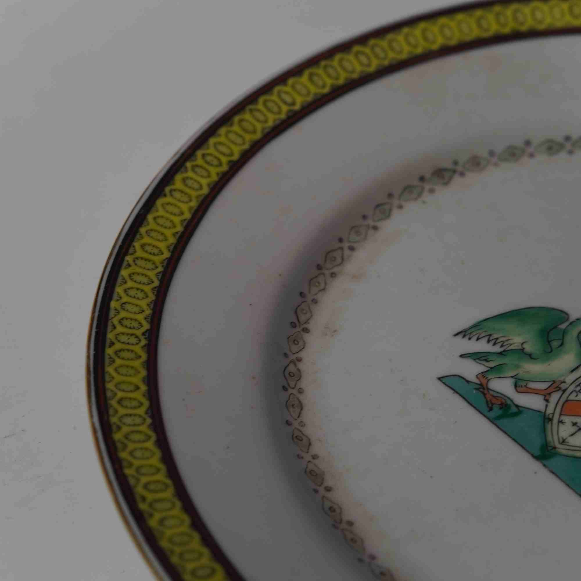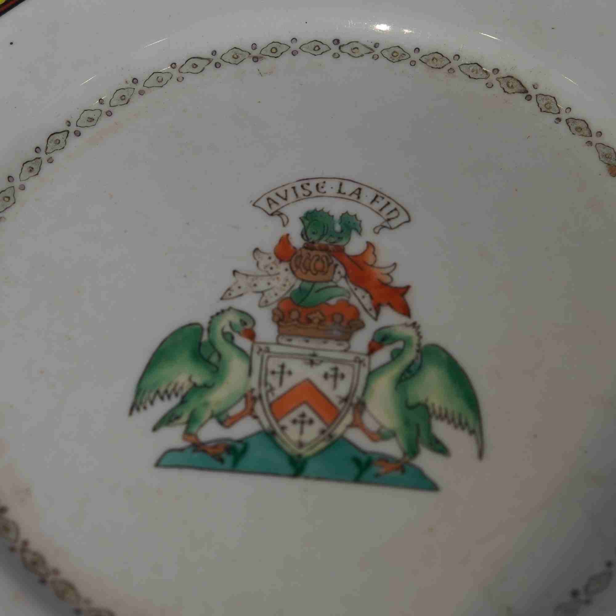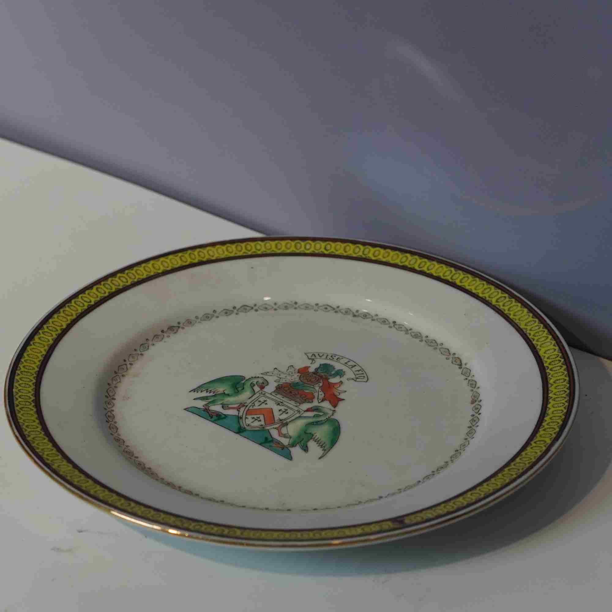 装饰工艺:瓷盘以白色为底色,盘心绘制着精美的徽章图案。徽章由多种元素构成,有盾牌形状的主体,盾牌上带有十字架等纹饰 ,盾牌两侧是绿色的禽鸟形象,上方还有类似冠冕的装饰以及写有文字 “AVISE LA FID” 的横幅。盘边有一圈装饰带,由细密的花纹组成,颜色主要是黄绿相间,最外侧边缘还有一道细细的金色线条,为瓷盘增添了精致感和华丽感。