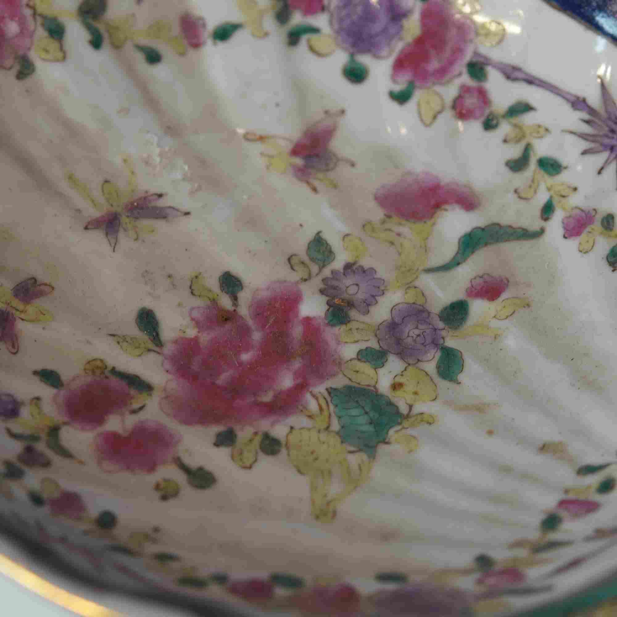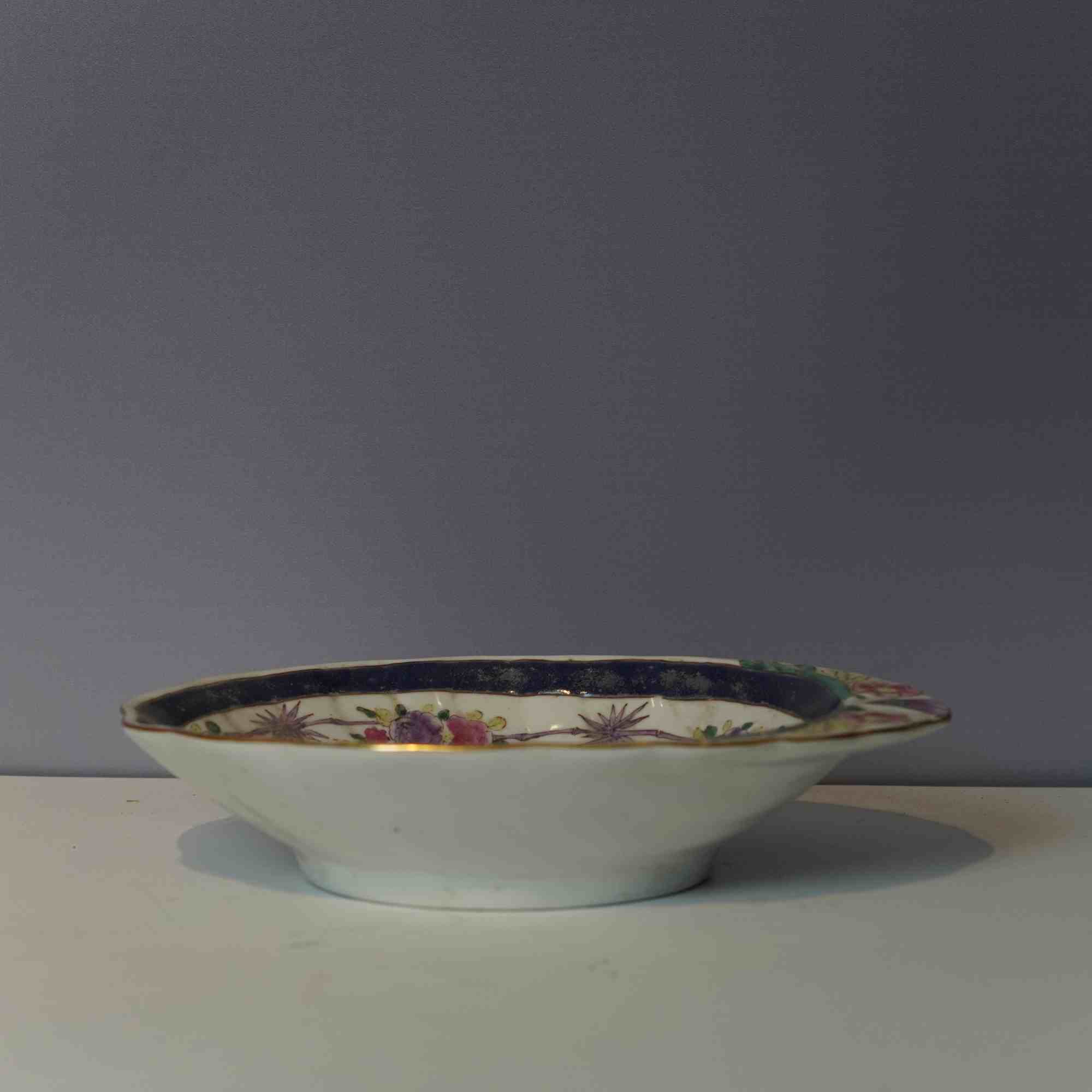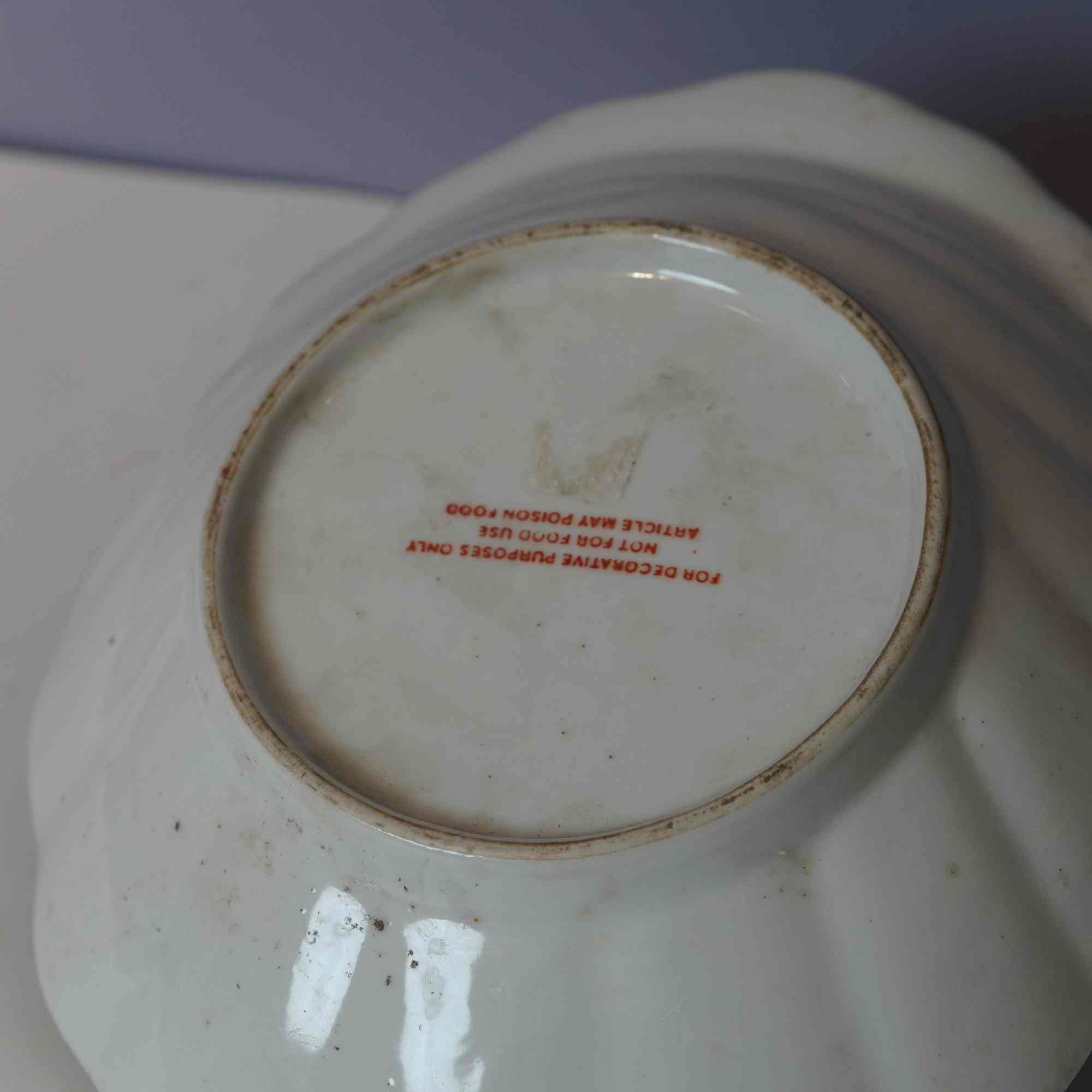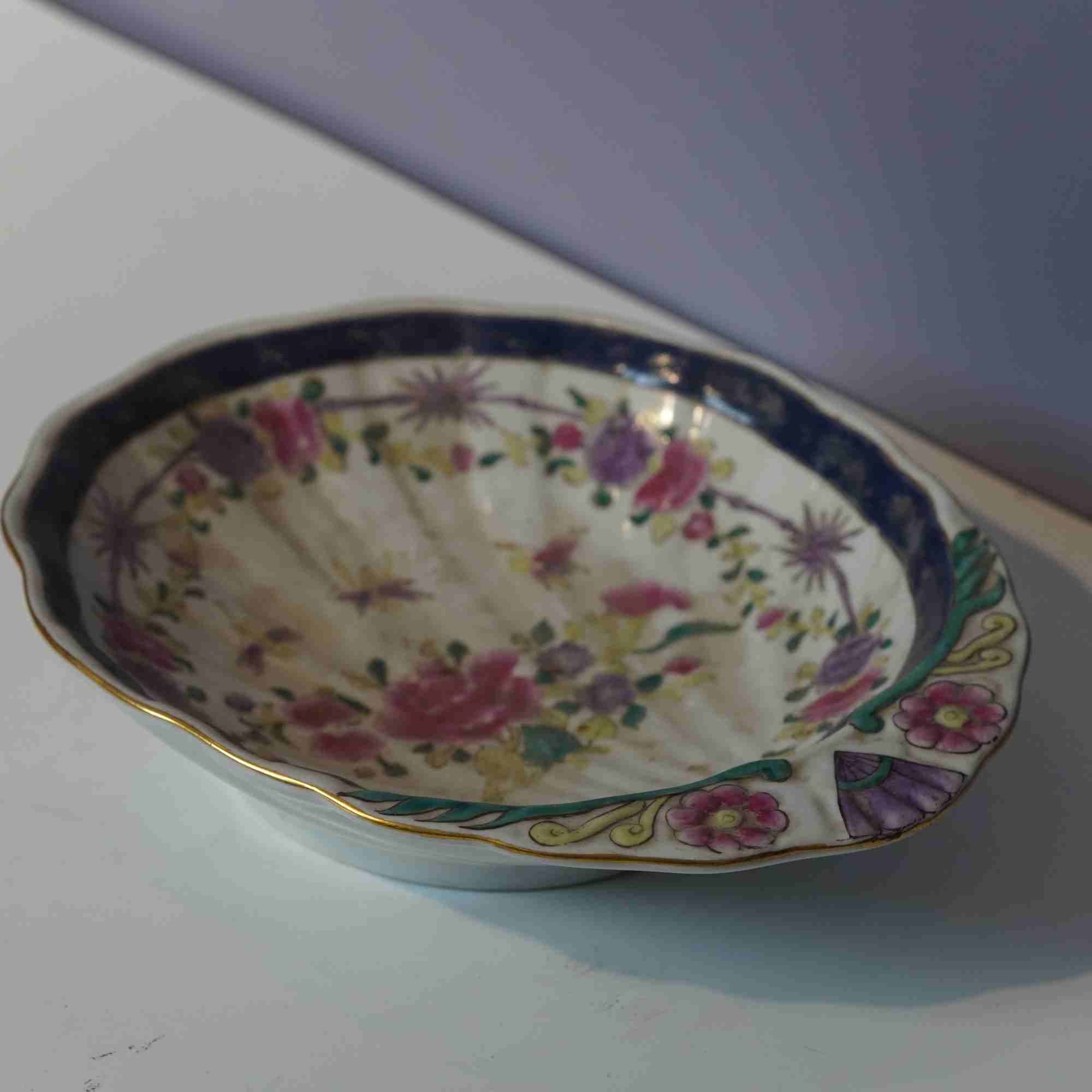 外观及工艺特点 造型:瓷盘边缘呈波浪形,富有曲线美感,整体造型别致,打破了传统规整的圆形设计,增添了几分灵动。 色彩:以白色为底色,盘身装饰有丰富多样的色彩,有粉色、紫色、黄色、绿色等。色彩搭配和谐,营造出一种绚丽多彩的视觉效果。 纹饰:盘内装饰着精美的花卉图案,花朵形态逼真,枝叶线条流畅,生动展现了花卉的娇艳与生机;边缘部分还有蓝色饰带以及绿边点缀的小型花卉图案,增加了纹饰的层次感和丰富度。此外,盘沿处还有描金装饰,提升了器物的精致感和华丽感。
