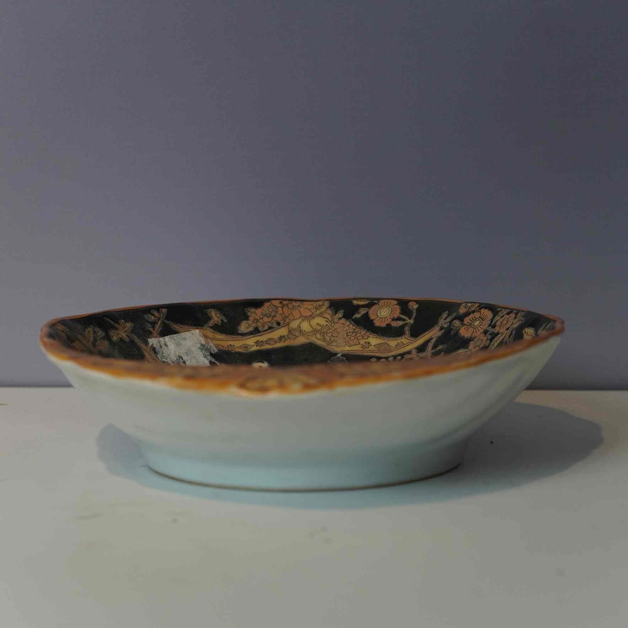 这是一件**广彩徽章瓷**,属于清代外销瓷品类。广彩以绚美色彩、繁缛纹饰闻名,此件瓷盘以黑为底色,运用金彩、红彩等绘制人物、花卉等图案,边缘黄彩装饰搭配花卉、器物纹样,既保留中国传统制瓷技艺,又融入西方定制需求,是中西文化贸易交流的实物见证,反映当时“来样定制”的外销瓷生产模式。