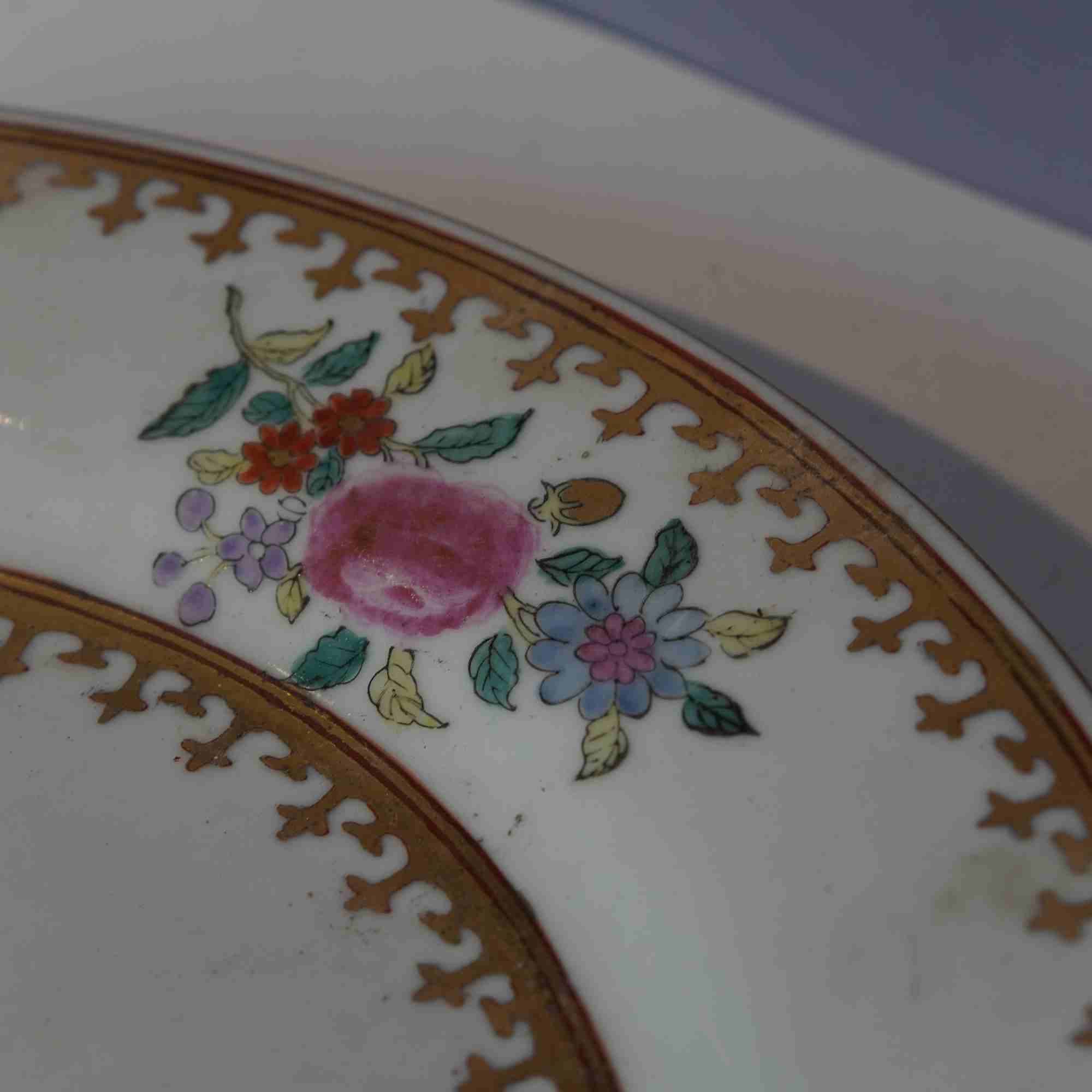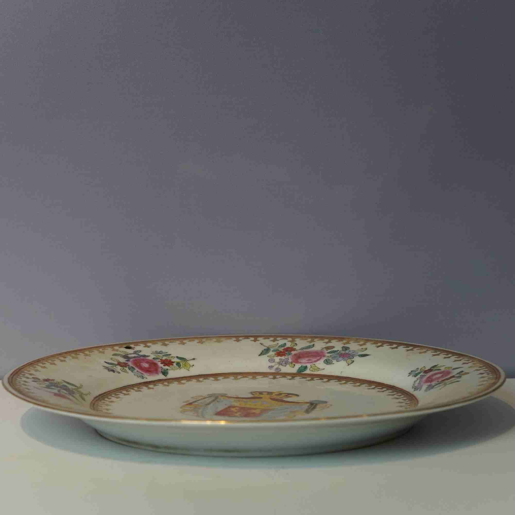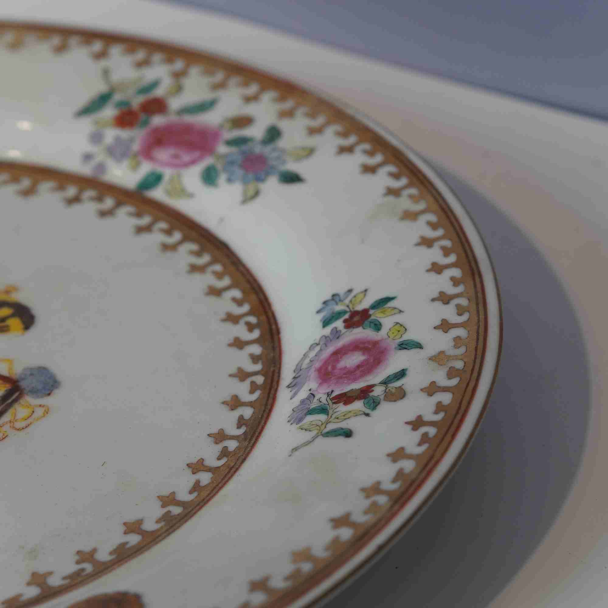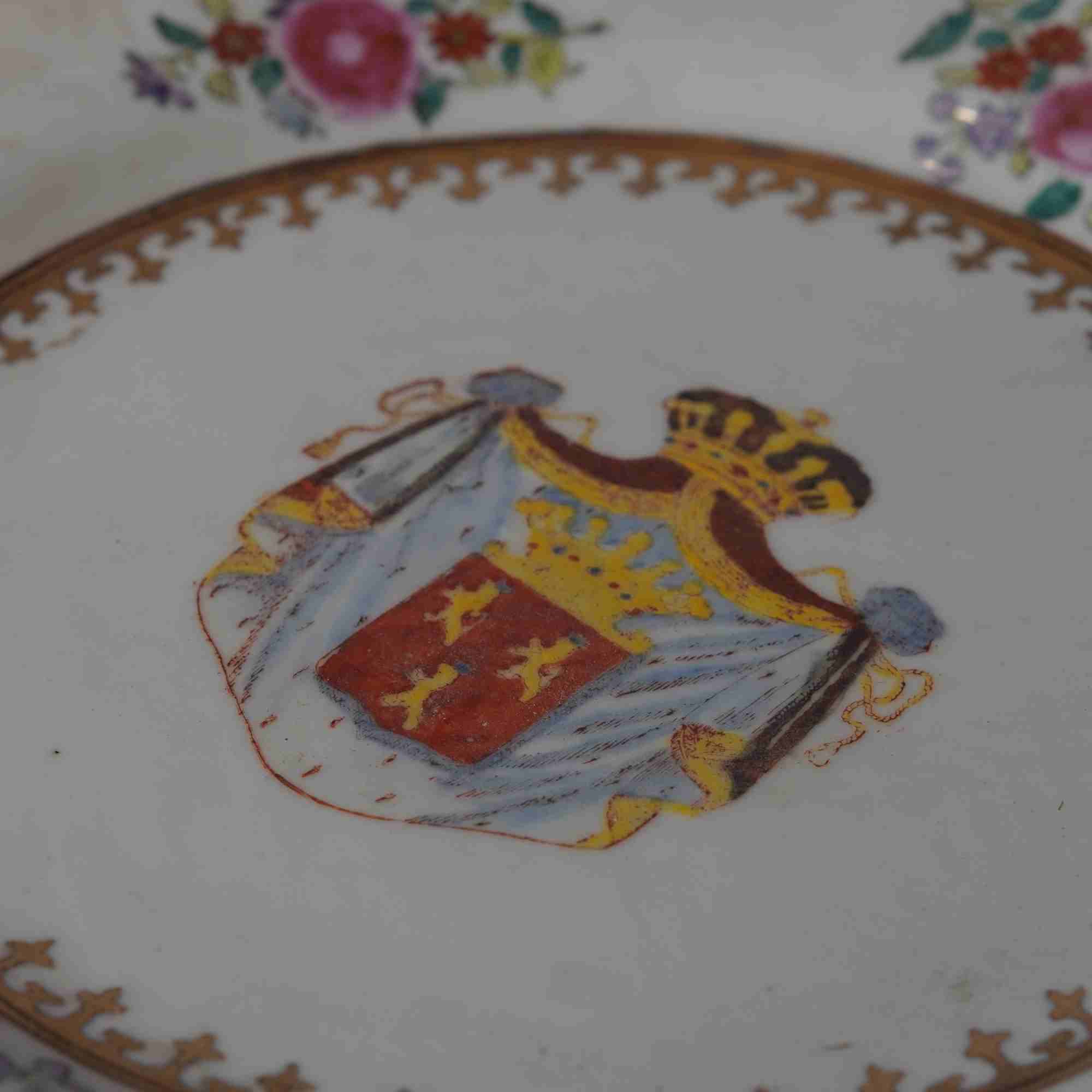 装饰图案:盘心绘制有精美的徽章图案,徽章中包含皇冠、盾牌等元素,色彩丰富,以红、黄、蓝等色调为主,这些元素通常代表着西方贵族或特定团体的身份与地位 ,是应西方客户定制要求绘制的。盘沿处装饰有多彩的花卉图案,花朵形态逼真,枝叶线条流畅,有粉色、红色等多种花卉,搭配以金色的边框纹饰,显得华丽而精致,体现了东方传统绘画艺术与西方审美趣味的融合。