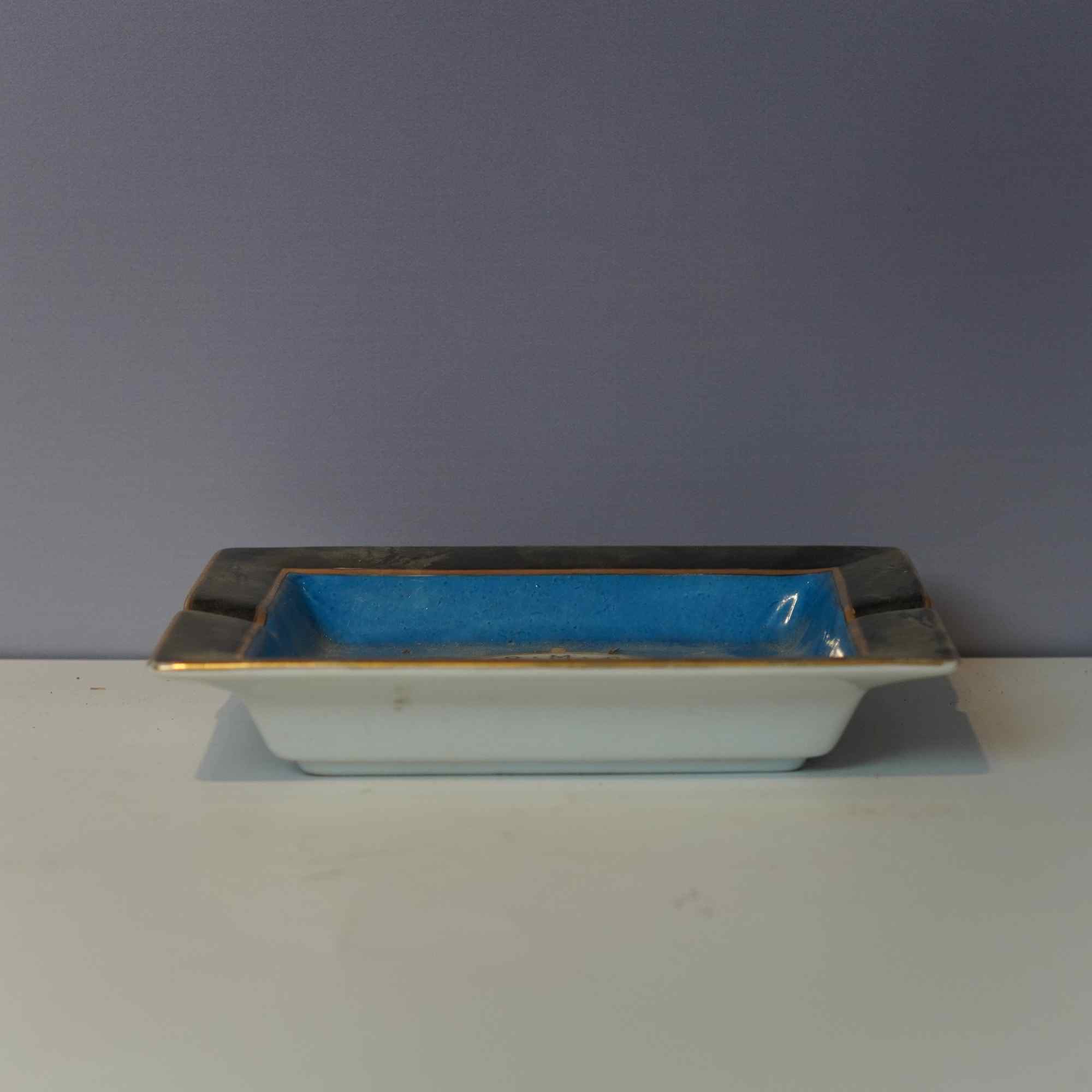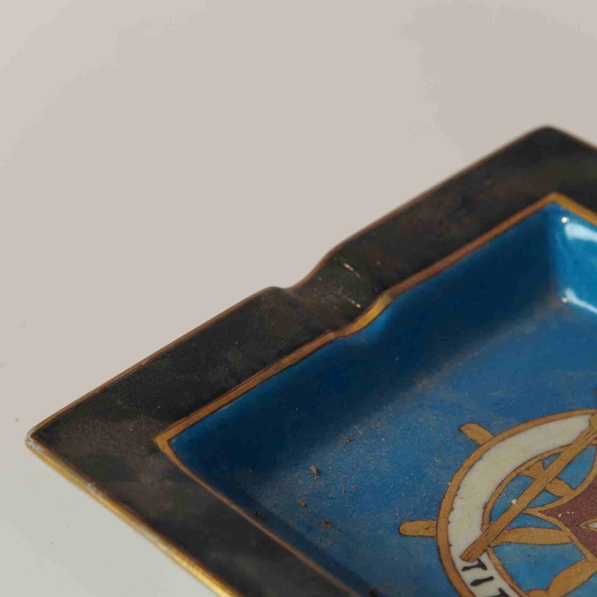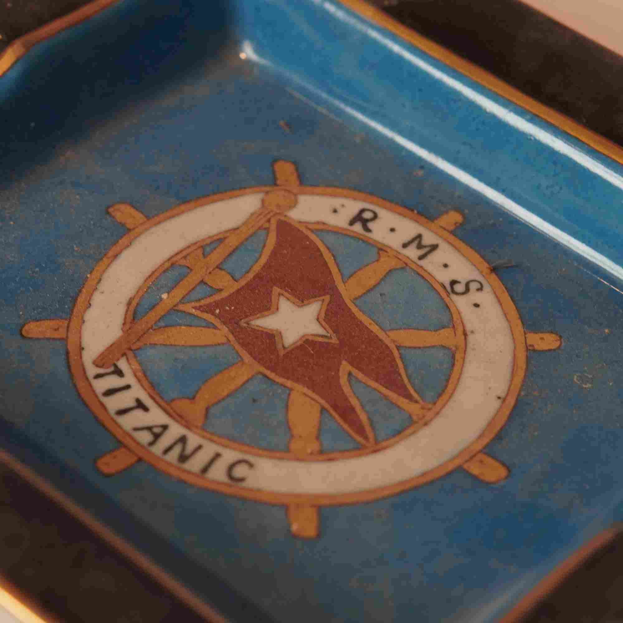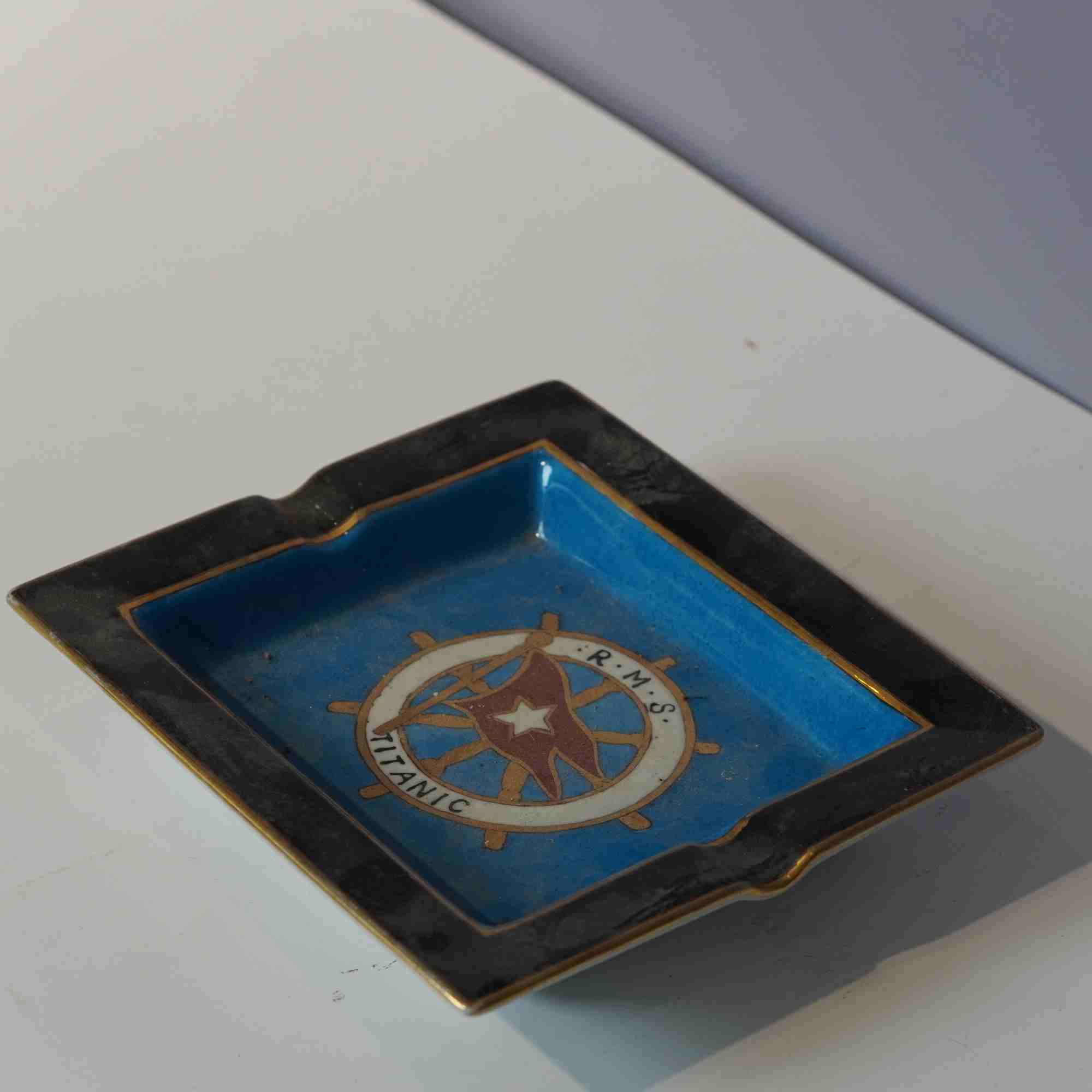 物品介绍 这是一款与泰坦尼克号相关的徽章烟灰缸。从外观来看,它呈方形,整体色彩搭配较为鲜明,外部边缘为黑色,内部底面是蓝色,在蓝色的底面上装饰有徽章图案。 徽章中间是一个类似船舵的图案,还带有一颗白色的星星,周围环绕着文字“R.M.S. TITANIC” ,“R.M.S.”是“Royal Mail Steamer”(皇家邮轮)的缩写,表明这是泰坦尼克号(Titanic)的专属标识 。从工艺上,烟灰缸边缘有描金处理,增加了精致感,采用陶瓷材质制作,经过烧制和彩绘等工艺完成。