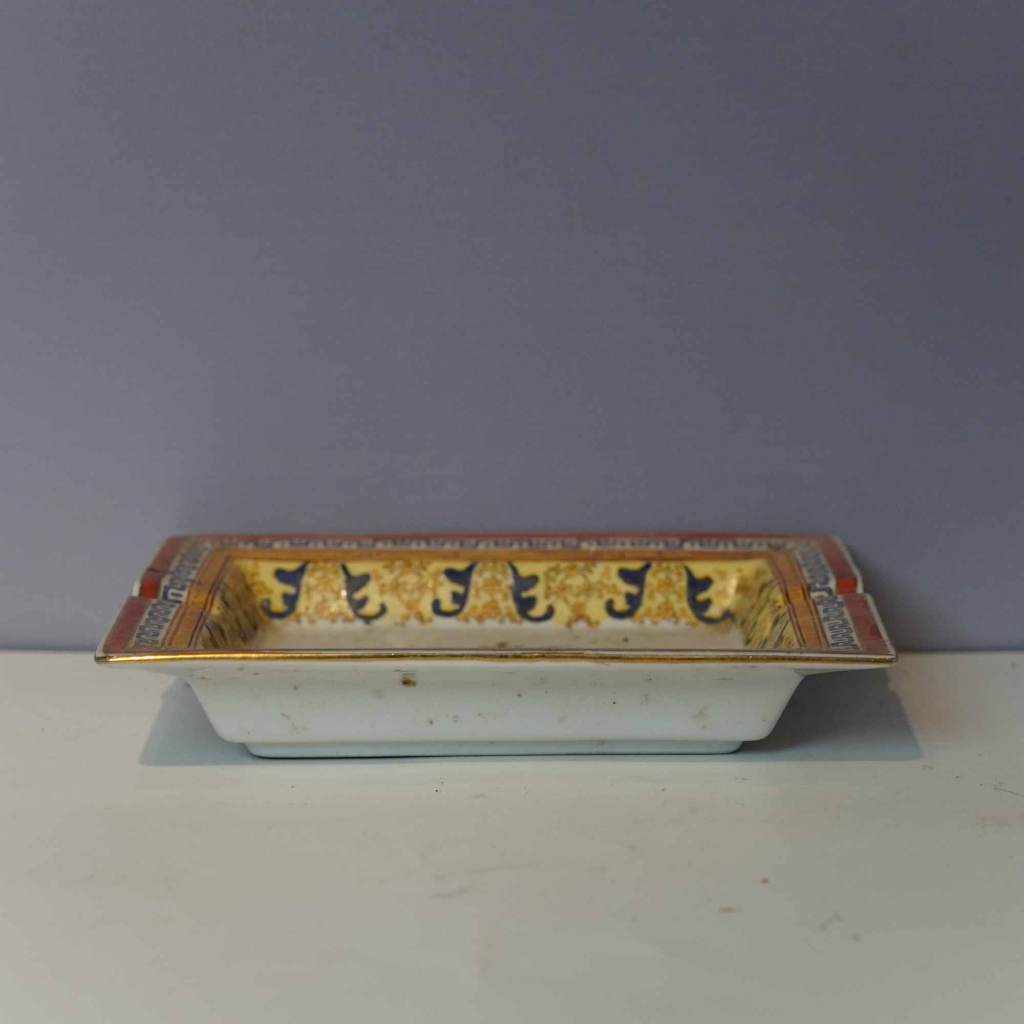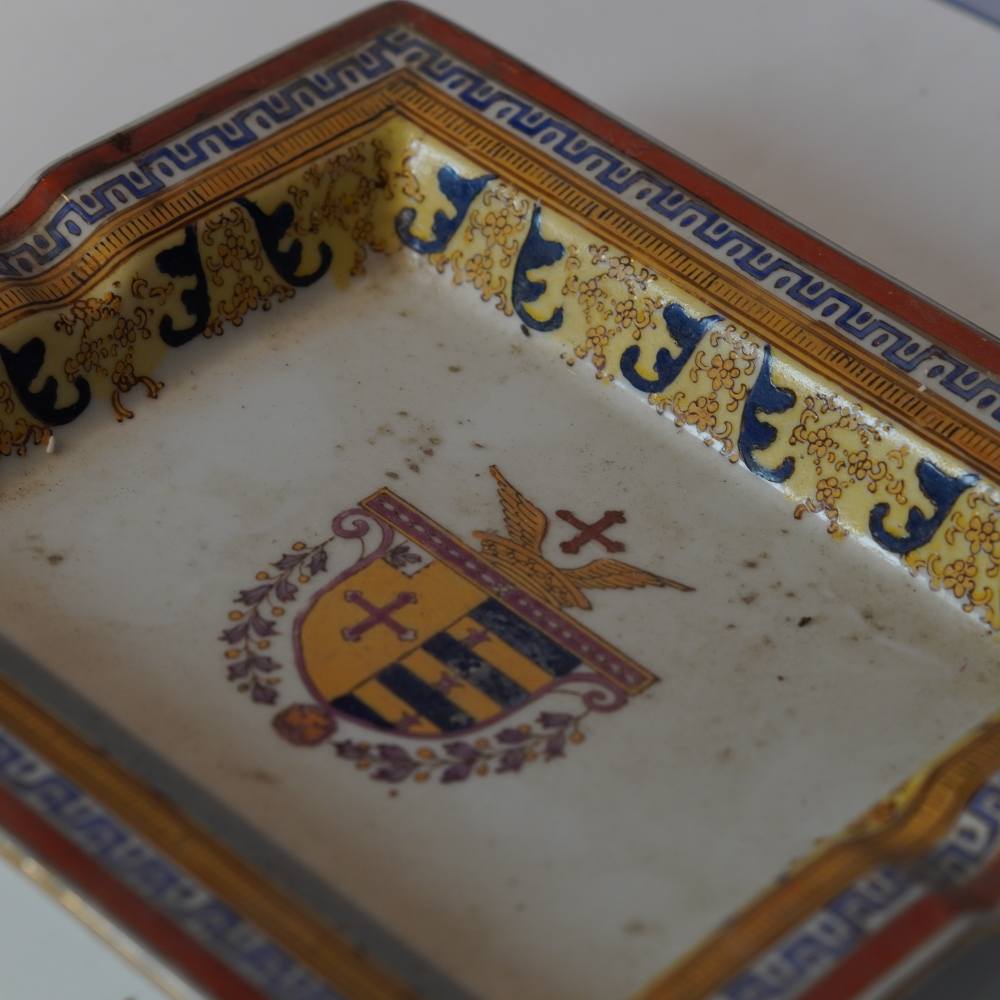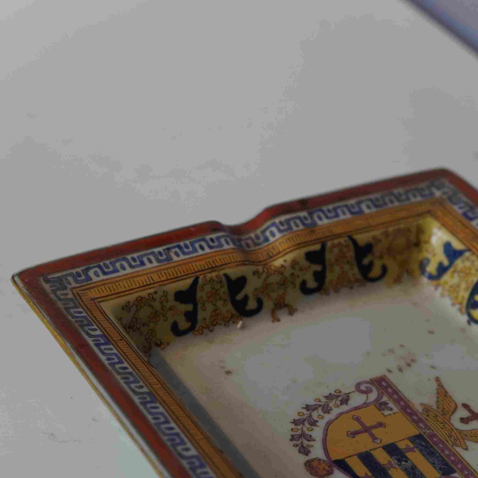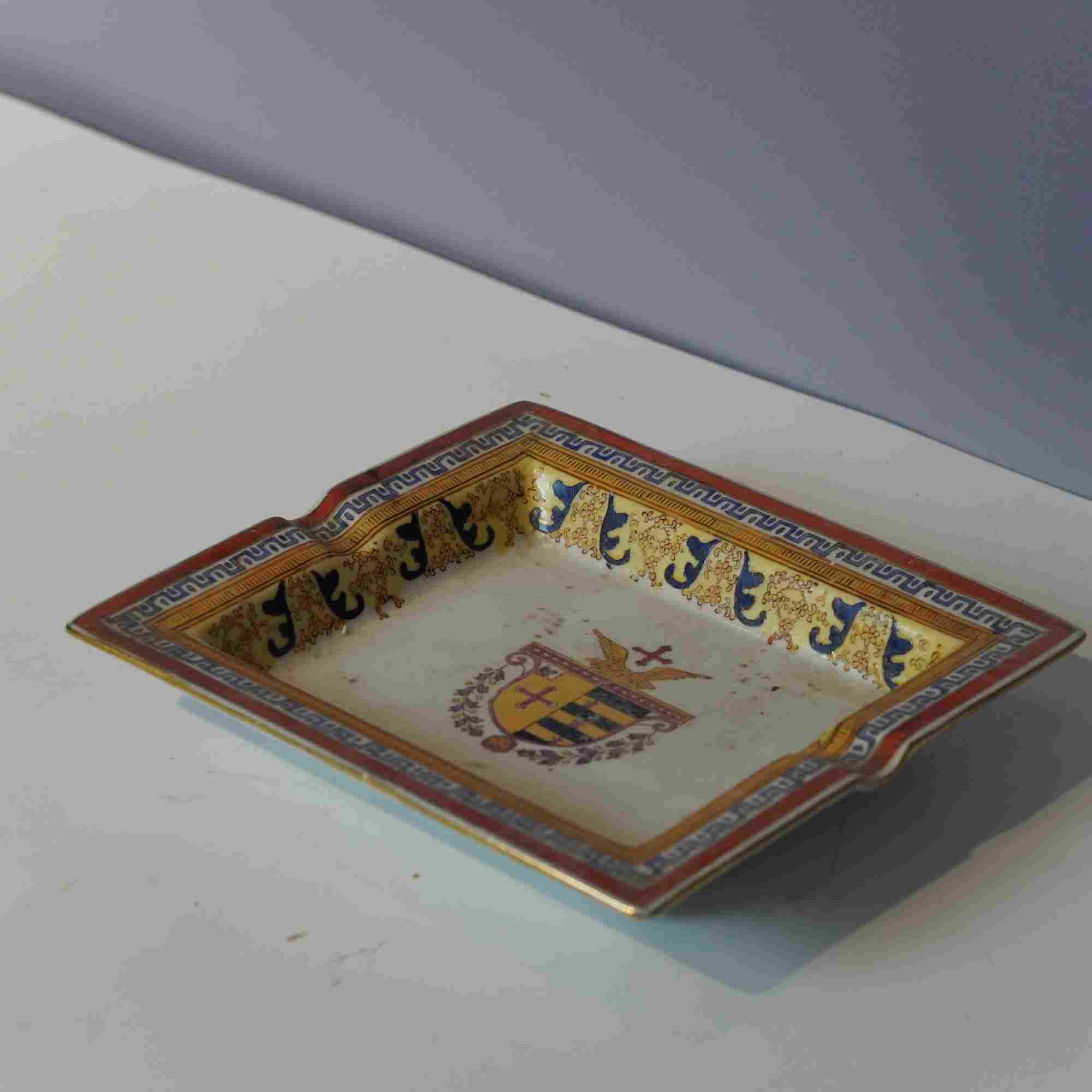 物品介绍 这是一件方形的陶瓷烟灰缸,属于徽章瓷制品。从工艺来看,它采用了较为精细的彩绘工艺,色彩搭配丰富且具有层次感。 烟灰缸的边缘有红色装饰线条,内侧边缘装饰有金色和蓝色相间的花纹图案,带有古典的回纹元素,增添了几分精致与典雅。烟灰缸底部中心位置绘制有徽章图案,徽章中包含皇冠、盾牌等元素,盾牌上有黑黄相间的条纹,这些元素通常象征着一定的身份和地位,为特定的家族、团体或机构定制 。