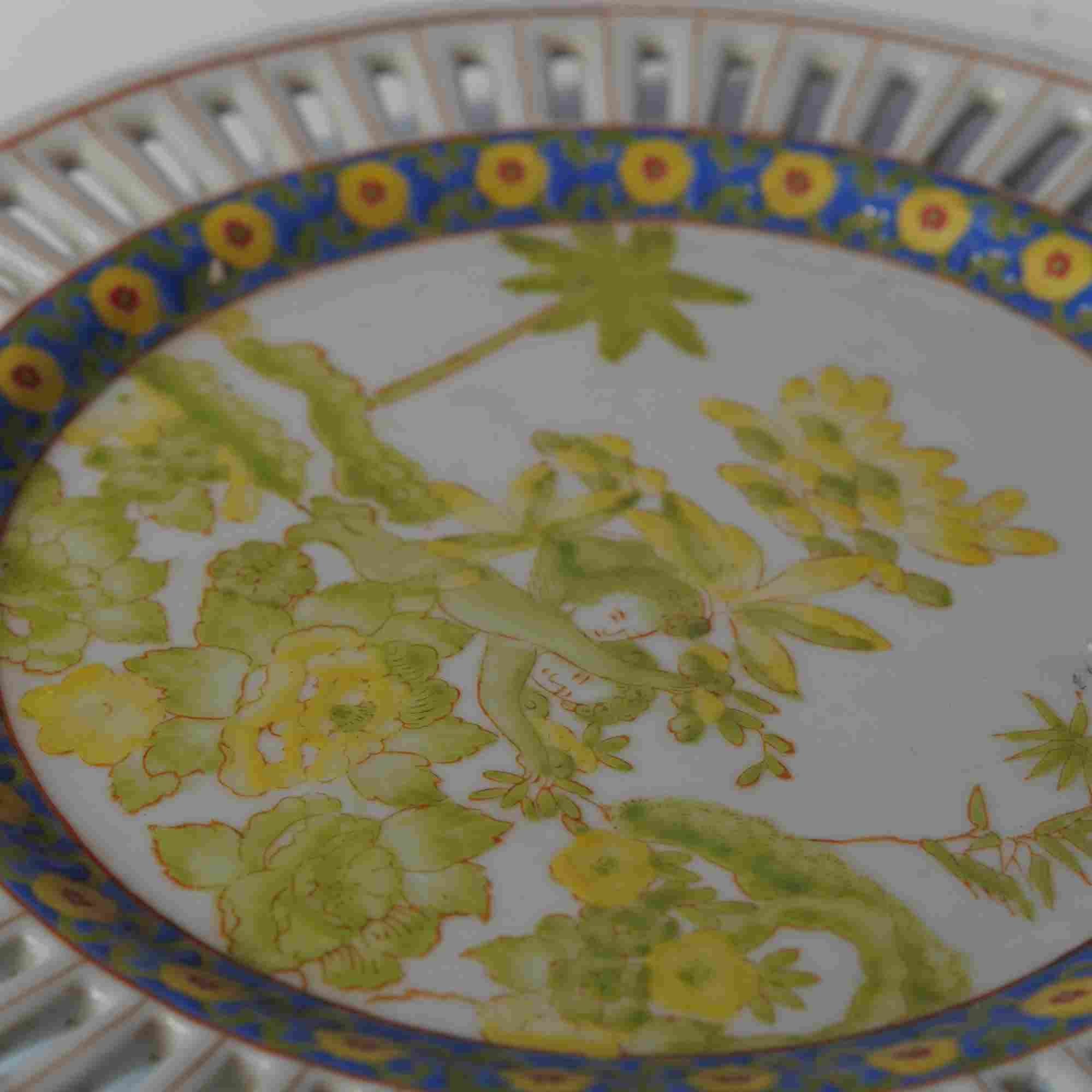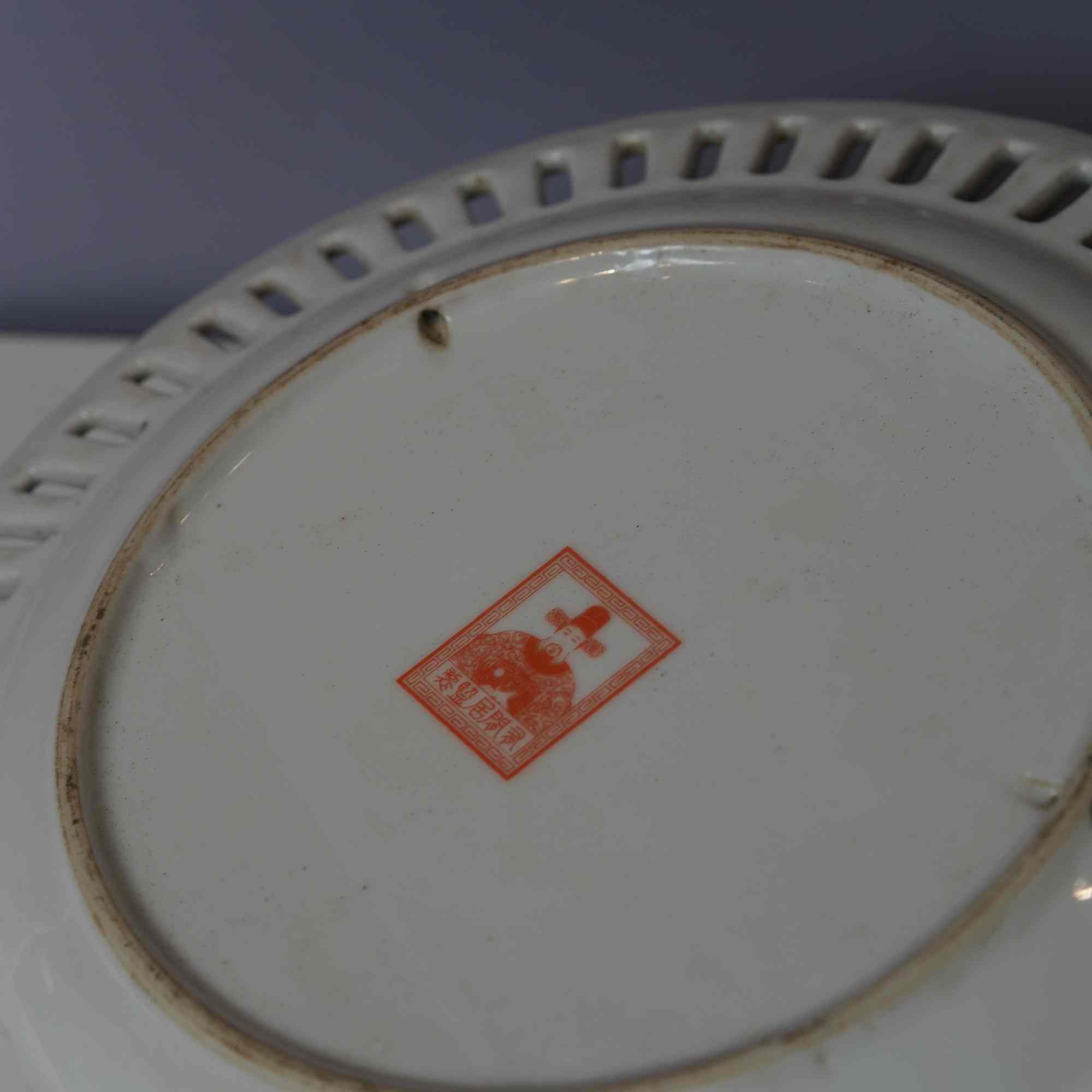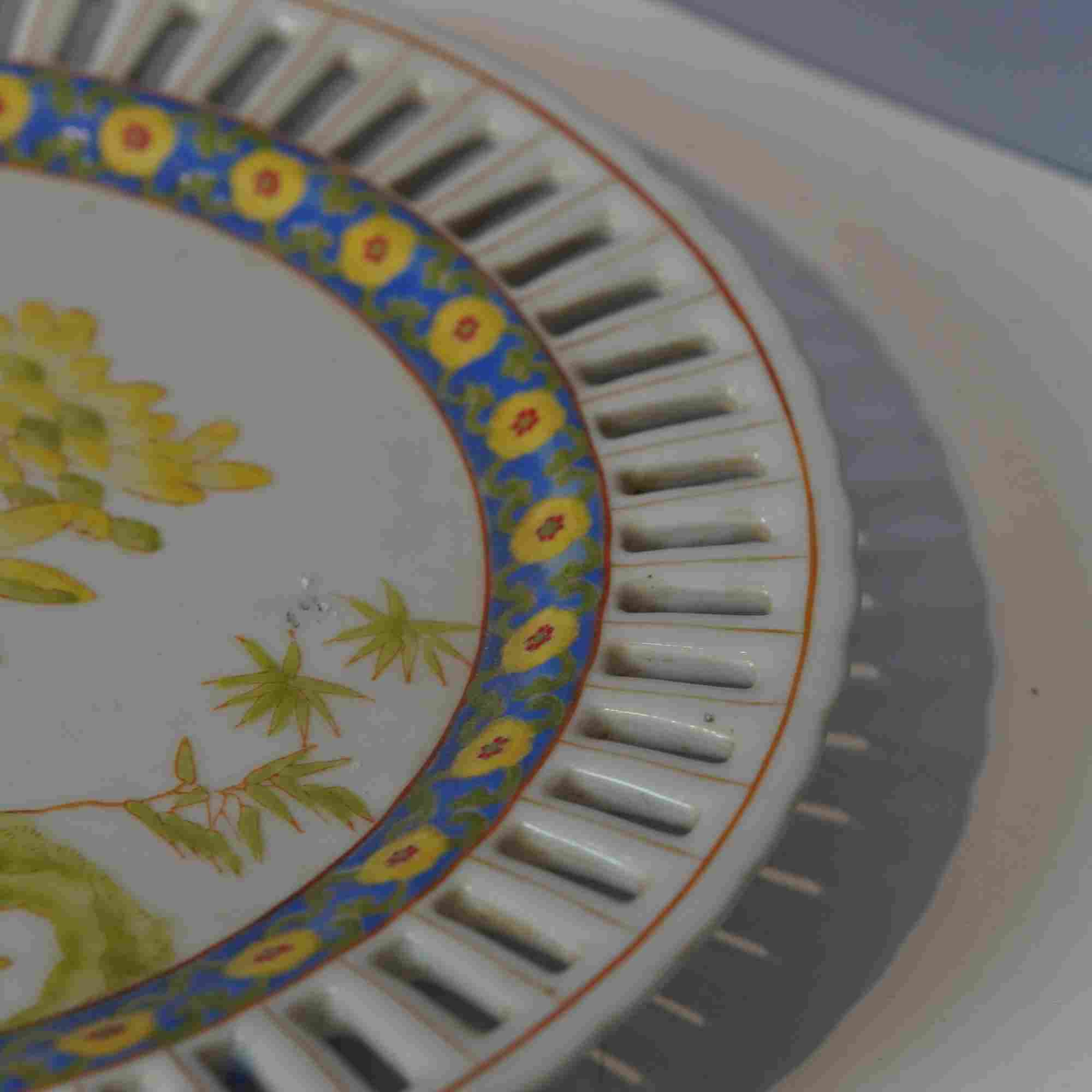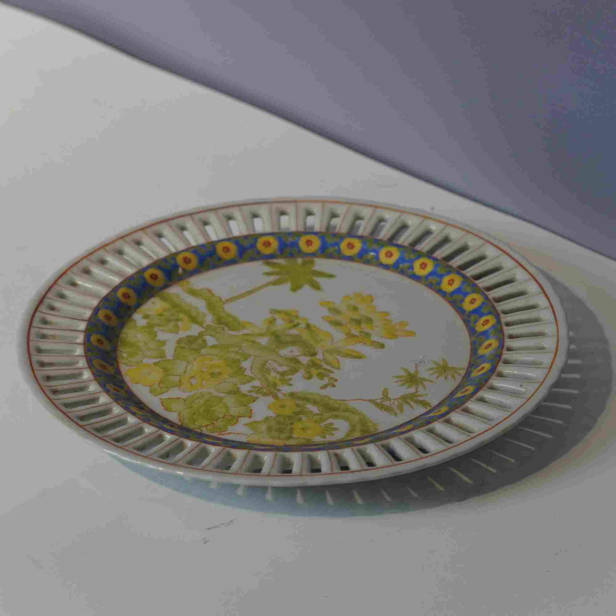镂空边彩绘瓷盘,属于外销瓷或工艺瓷范畴。瓷盘边缘有镂空设计,蓝底黄圈纹饰精致,盘心以绿、黄等色彩绘花卉、植物,风格兼具东方彩绘细腻与装饰性。工艺上,镂空与彩绘结合,展现制瓷巧思,可能用于装饰或实用,是传统瓷艺创新之作,反映对美观与工艺融合的追求。