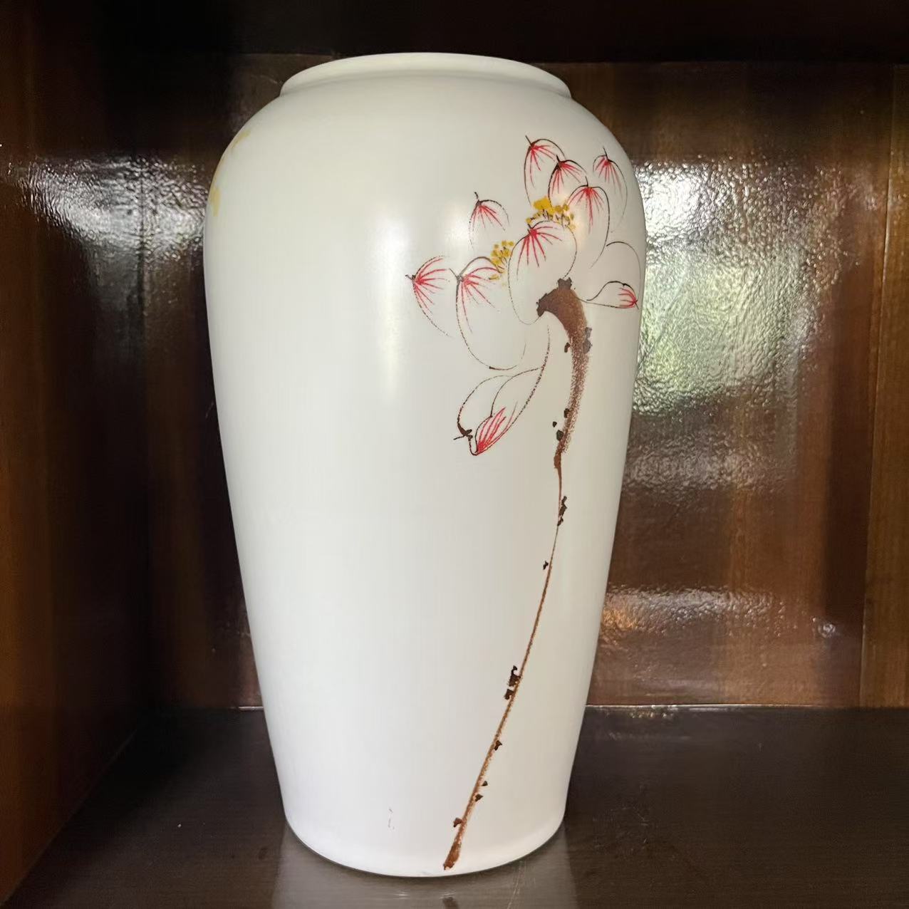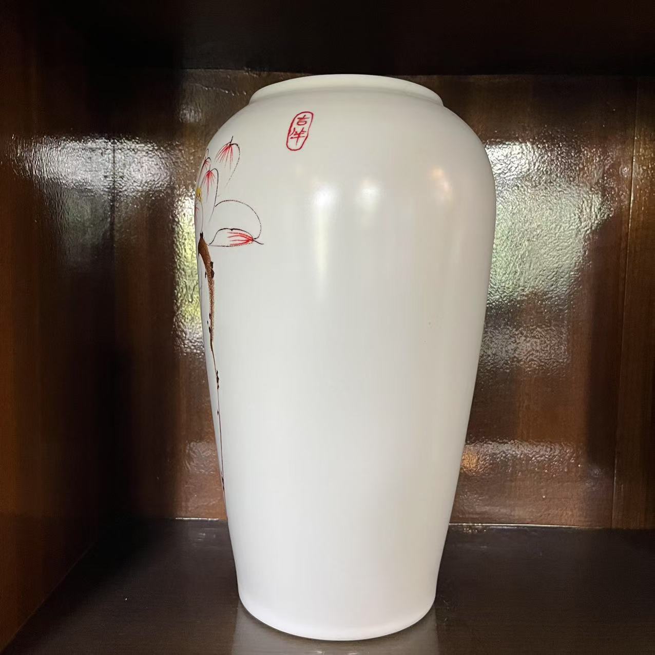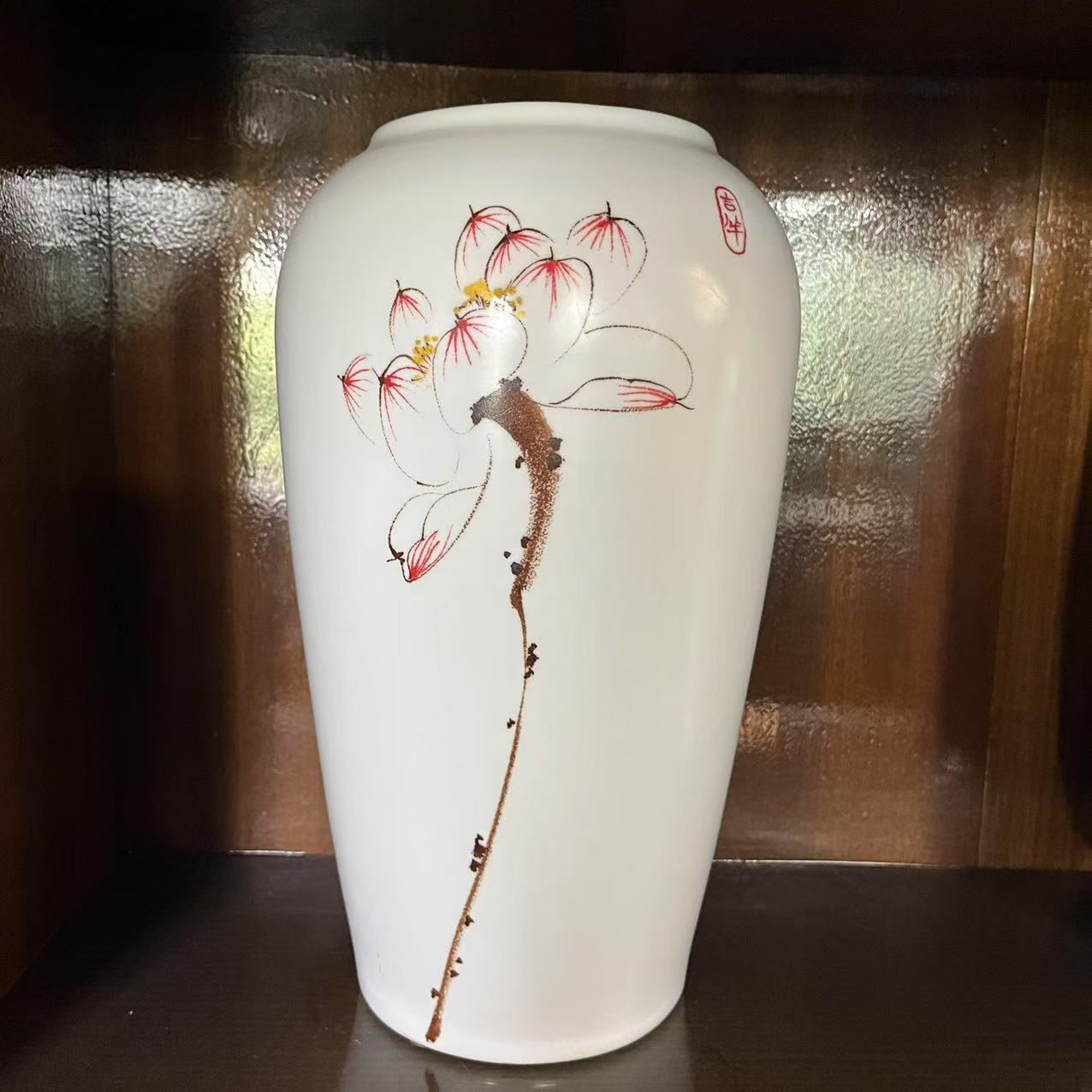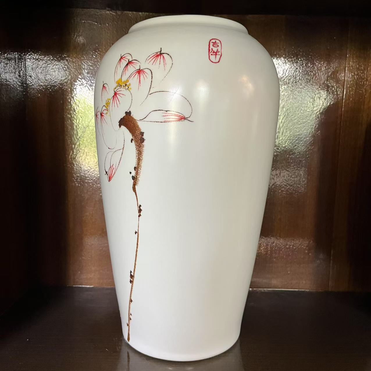 纯白瓷为底,手绘荷花绽于瓶身,红瓣、棕茎,简约勾勒东方雅韵。 插几枝新花,是茶室、书房的诗意点缀;摆于案头,又成中式空间的独特风景,实用与美学兼具,为生活添一抹清雅 。